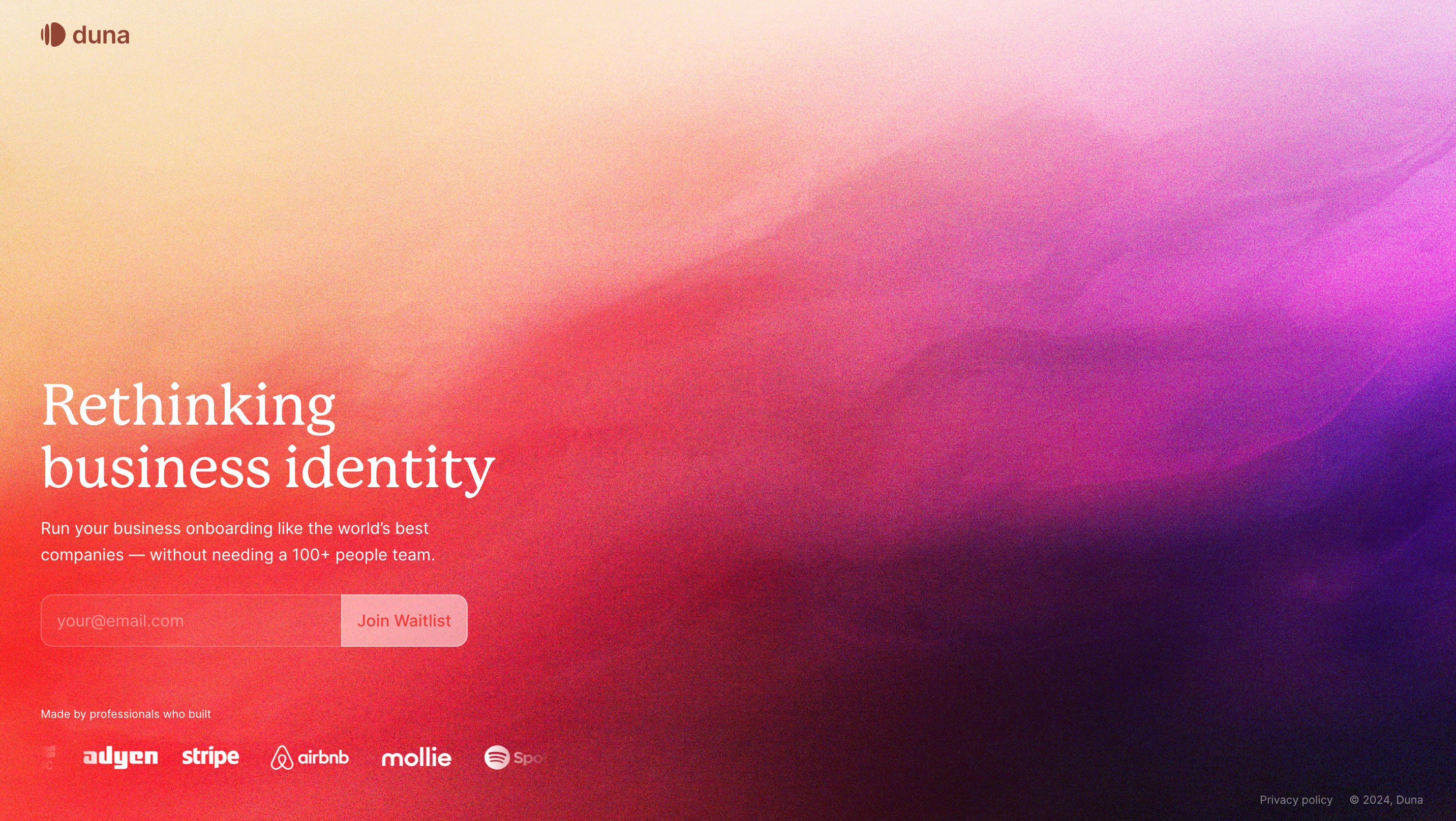 Based on the information available online, it appears that Duna will likely provide an application for the following solutions: simplifying compliance with relevant regulations during onboarding processes, increasing conversion rates by streamlining the onboarding experience, and automating re-verifications of business identities over time to maintain up-to-date records. The overview of their exact product will be added later when more info is available.